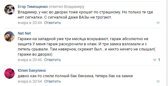 Водители советуют оставлять машины под окнами: во время комендантского часа шансы, что воришек заметят в гаражном кооперативе или на стоянке, почти нулевые. “У меня под окном за месяц 3 раза вскрывали машину”. “У нас во дворах тоже крошат по-трашному. Но только те, где нет сигналки. С сигналкой даже ВАЗы не трогают”. “Гаражи на западной уже три месяца вскрывают, гараж абсолютно не защита. У меня гараж раскурочили в хлам. И три замка взломали, и с петель срывали. Там, наверное, скрежет был.., и никто ничего не слышал( гаражи во дворах)”, - пишут пользователи.