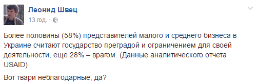 "Более половины (58%) представителей малого и среднего бизнеса в Украине считают государство преградой и ограничением для своей деятельности, еще 28% – врагом. (Данные аналитического отчета USAID). Вот твари неблагодарные, да?" - отметил он.
