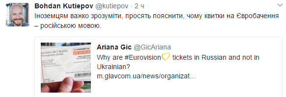 К критике билетов присоединился и журналист Богдан Кутепов. «Иностранцам тяжело понять, просят пояснить, почему билеты на «Евровидение» — на русском языке», — написал он в Twitter.