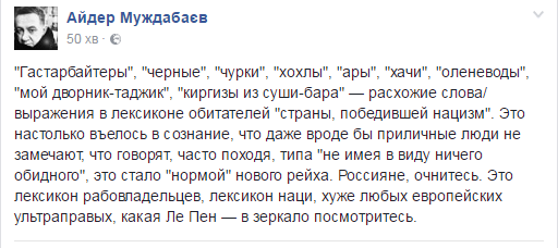 Половина россиян, по данным последнего соцопроса, считает положительной роль Сталина в войне. Полоумный народ, воистину. "Гастарбайтеры", "черные", "чурки", "хохлы", "ары", "хачи", "оленеводы", "мой дворник-таджик", "киргизы из суши-бара" — расхожие слова / выражения в лексиконе обитателей "страны, победившей нацизм". Это настолько въелось в сознание, что даже вроде бы приличные люди не замечают, что говорят, часто походя, типа "не имея в виду ничего обидного", это стало "нормой" нового рейха.