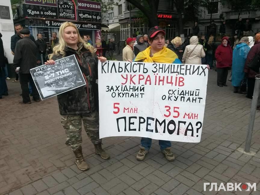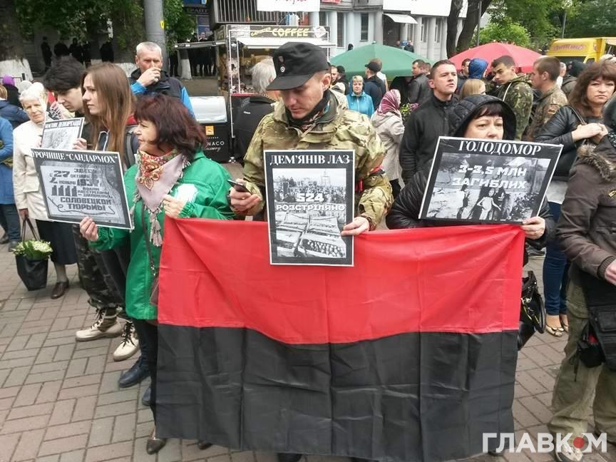 Як повідомляє кореспондент «Главкома», тут сталася невелика сутичка між учасниками акції і її противниками. Спочатку це була словесна перепалка, яка пізніше переросла у штовханину. Чоловік намагався зірвати «георгіївську стрічку» з літньої жінки.