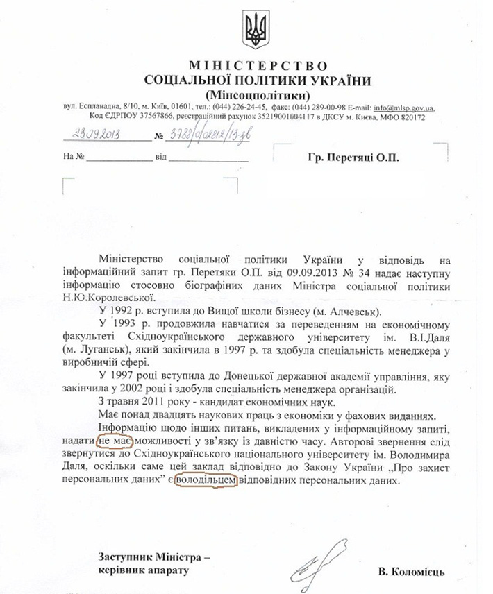 Заинтересовавшись этими вопросами, мы обратились к администрации луганского ВУЗа с журналистским запросом и просьбой ознакомиться с личным делом студентки – нынешним министром. 19.03.2013 г. первый проректор университета М.Ф. Смирный ответил отказом в информации журналисту, сославшись на то, что «обработка и передача персональных данных относительно Королевской Н.Ю. возможна лишь при ее согласии».