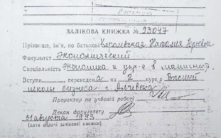 Таким образом, мы получили ответы на поставленные ранее два вопроса. Выходит, что Королевская переводилась в луганский университет по липовой справке из несуществующего учебного учреждения. Теперь осталось установить, а училась ли вообще в ВНУ им. В. Даля Н.Ю. Королевская? В наши руки от ответственного университетского работника, пожелавшего остаться неизвестным, попала ксерокопия зачетной книжки № 93047 выданная 31.08.1993 г. на имя студентки Королевской Наталии Юрьевны со штампом «Луганский машиностроительный институт» и с информацией «факультет экономический, специальность экономика и управление в машиностроении, переведена на 2-й курс с Высшей школы бизнеса г. Алчевска».