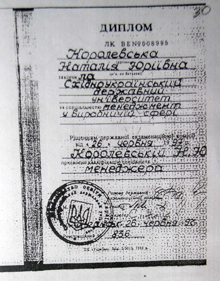 У следователя в деле подшита академическая справка №28, «выданная гр. Королевской Наталии Юрьевне в том, что она обучалась с 01 сентября 1992 г. по 01 июля 1993 г. в Международном институте управления, бизнеса и права по специальности промышленный менеджмент дневная ф/о». В справке на месте гербовой печати почему-то стояла печать с аббревиатурой «АБЦ» - Алчевский бизнес-центр.