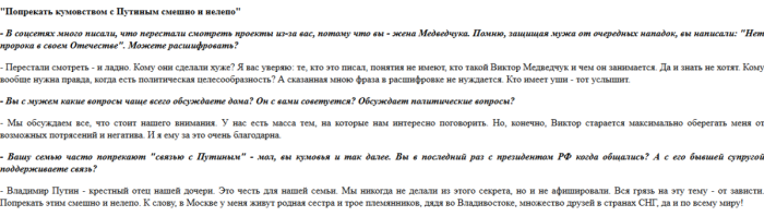 В интервью «КП» в Украине» супруга политика, лидера организации «Украинский выбор» Виктора Медведчука прокомментировала то, что их семью часто попрекают «связью с Владимиром Путиным».