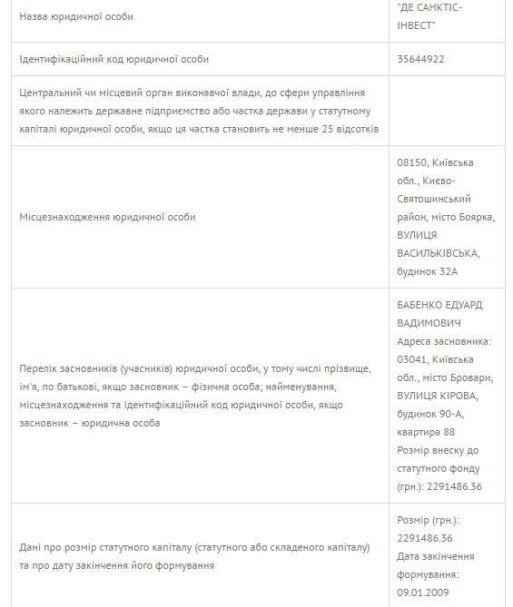 В итоге «Де Санктис Инвест» постепенно вышла из состава учредителей всех дочерних фирм при полном бездействии украинских властей, которые не предприняли попыток помешать объявленному в розыск Азарову-младшему зарабатывать на продаже нажитого «непосильным трудом» имущества. К началу этого года «Де Санктис Инвест» завершил процесс очистки, став полноценной «пустышкой». Далее его хозяевами был запущен сценарий избавления от лишнего балласта. Как выяснил «ОЛИГАРХ», для этого компанию переоформили на юриста из Броваров Эдуарда Бабенко и прописали ее по адресу массовой регистрации в Боярке.