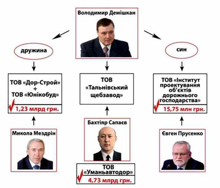 Видання "Наші гроші" пов’язує власника ПАТ "Уманьавтодор" пана Сапаєва з Володимиром Демішканом. Останній очолював Укравтодор за часів прем’єрства та президентства Віктора Януковича.