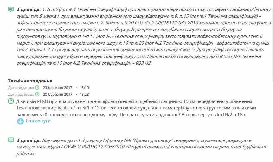 У тендерному процесі, який тривав місяць, активно уточнювались умови виконання робіт, використання матеріалів, самих ділянок що підлягають ремонту. Це може вказувати, власне, на значне зацікавлення одного чи кількох замовників (запитання анонімні) отримати підряд та знання цих охочих усіх тонкощів ремонту доріг та чинного законодавства.