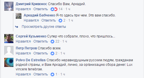 "Огромное спасибо всем. Я горжусь вами. Собственно, это то, для чего и должна существовать журналистика", - написал Бабченко и поблагодарил всех, кто участвовал в сборе средств.