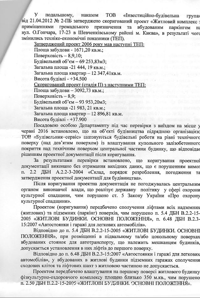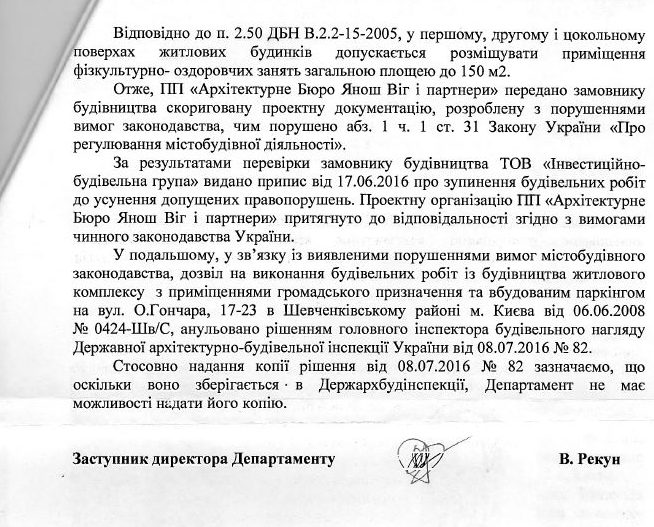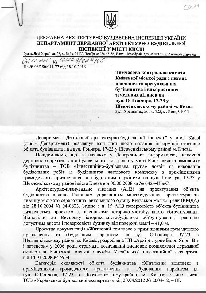 2 ноября 2016 г. ВКК получила подробную информацию о стройке на ул. Гончара, 17-23 и нарушениях строительных норм от Департамента государственной архитектурно-строительной инспекции в г.Киеве. Ниже приведен текст ответа на запрос.