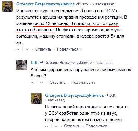 Известный украинский блогер с ником Necro Mancer опубликовал в социальной сети скриншот сообщения польского боевика, который подтвердил информацию о подрыве "Урала" с пророссийскими террористами.