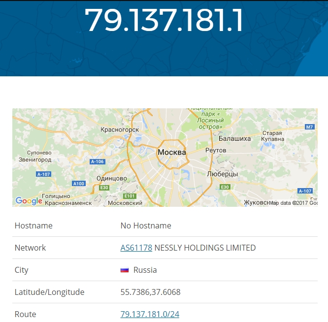 Решил посмотреть, где физически находится сервер, содержащий сайт. IP-адрес этой поделки следующий: 79.137.181.1