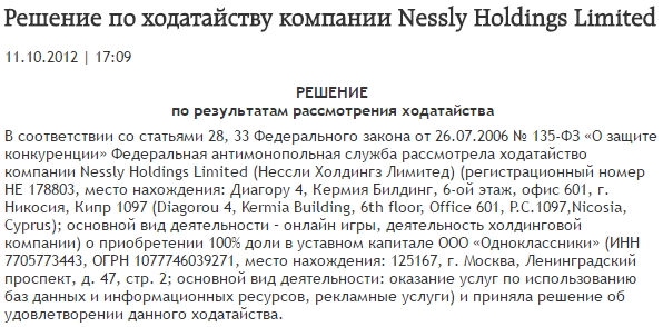 Быстрый поиск компаний под названием NESSLY HOLDINGS LIMITED показал, что это зарегистрированная в Кипре фирма, которая в 2012 году… приобрела 100% долю в уставном капитале ООО «Одноклассники» (по ссылке — разрешение российской антимонопольной службы), а потом через пару месяцев перепродал эту долю другому кипрскому офшору, ODNOKLASSNIKI HOLDINGS LIMITED.