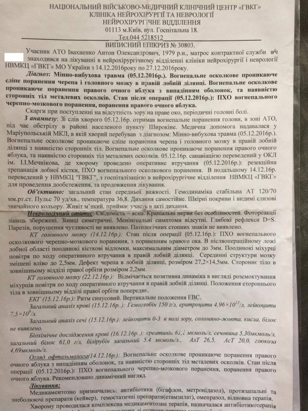 В декабре 2016 года попал под обстрел в Широкино. Получил осколочно-минное ранение черепа. Ранение сложное и неприятное, с проникновением осколков в головной мозг и травмой глазного яблока с выпадением оболочки. Такое требует не одной операции. В конце апреля сделали очередную операцию, которая длилась около четырех часов. Врачи изъяли костные осколки, поставили титановую пластину. Сейчас бойцу предстоит длительная реабилитация, а в дальнейшем – ряд операций по удалению глазного яблока и протезированию. Свои средства постепенно иссякли, поэтому необходима помощь