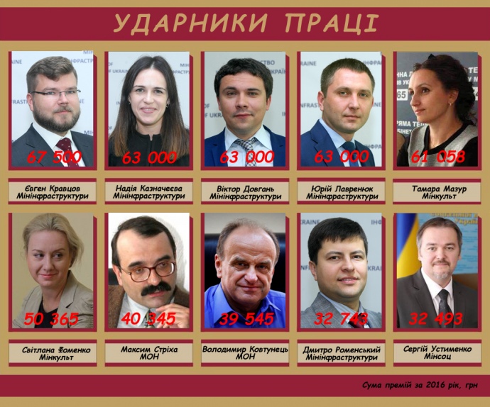Найбільші суми премій за 2016 рік серед заступників міністрів