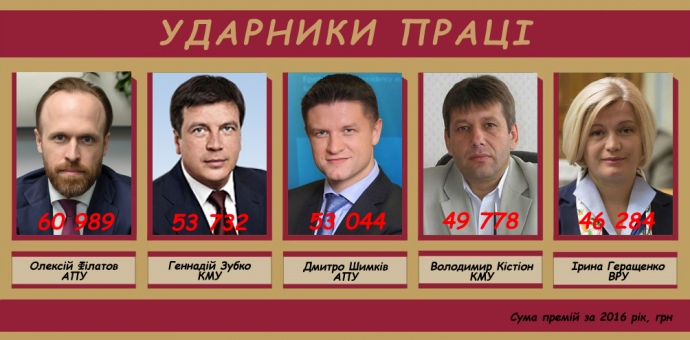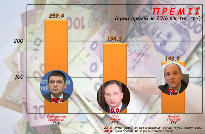 Найбільші суми премій за 2016 рік серед керівників уряду, парламенту та Адміністрації президента