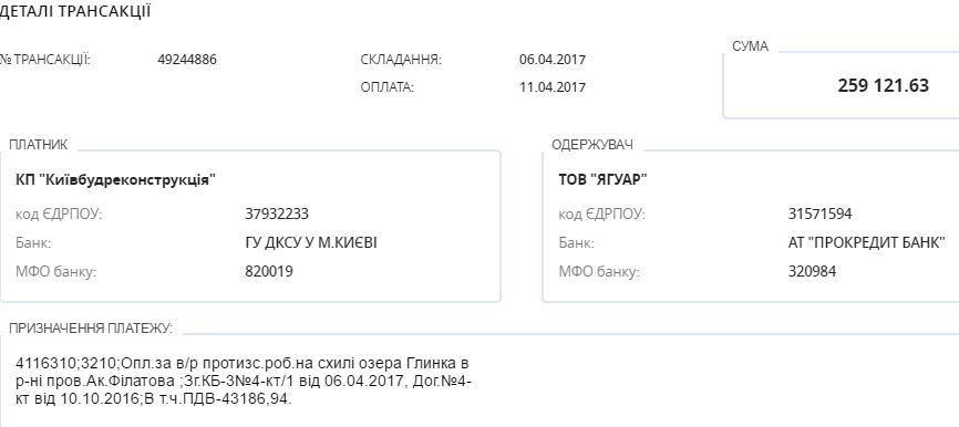 Останній платіж, згідно з порталом Є-дата, від «Київбудреконструкції» ТОВ «Ягуар» датується 11 квітня цього року.