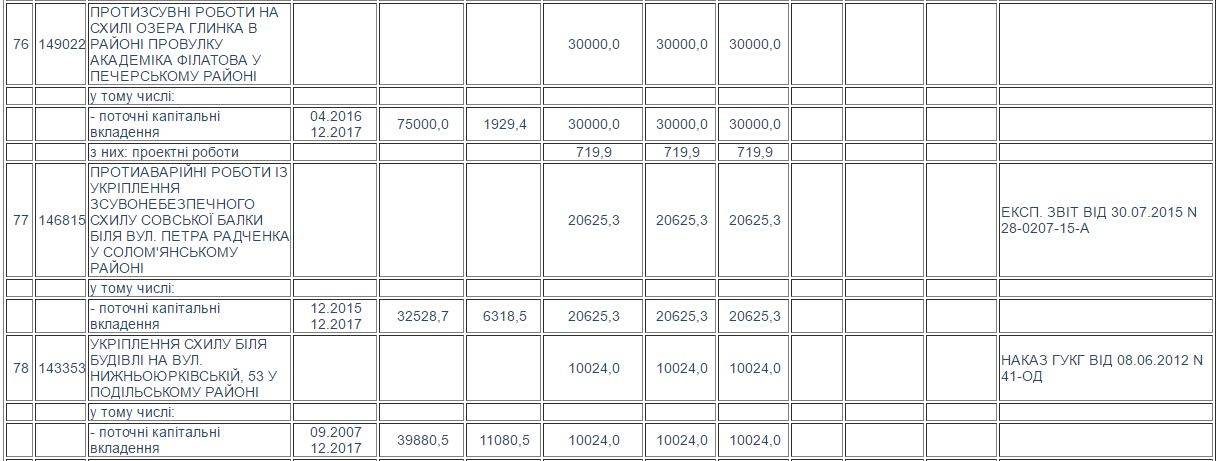 Згідно з Програмою, «Київбудреконструкція» мала за 30 000,0 тис. грн. знайти підрядника, щоб той провів протизсувні роботи на схилі озера Глинки в районі провулку Академіка Філатова у Печерському районі столиці. За ці гроші підрядник -ТОВ «Ягуар» - до кінця 2017 року має вирубати зелені насадження та знести нинішні укріплення, а потім влаштувати підпірні стінки, випуски, технологічний проїзд, дощову каналізацію, насосну станцію, огорожу та газони.