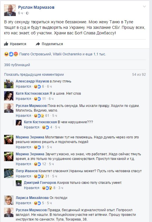 Татьяну Мармазову внезапно решили выдворить из России в Украину. Муж Руслан тут же забил тревогу в Фейсбуке, после чего в комментариях начался настоящий праздник. Переносчики русского мира стали потешно взывать к совести и родине и комично потрясать кулачками. На запах вкусной еды сползлись тролли. Комментарии под постом можно просто разбирать на цитаты.