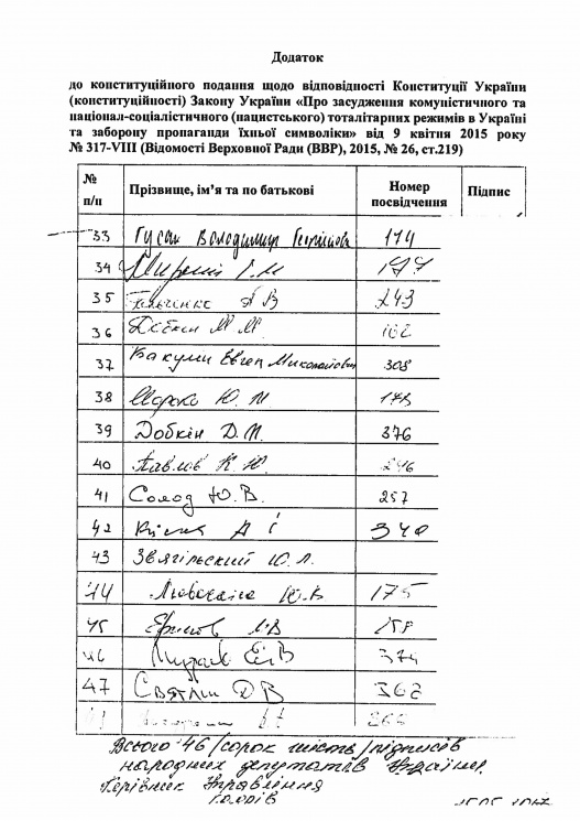 30 травня 2017 року до Конституційного Суду України надійшло конституційне подання 46 народних депутатів України щодо відповідності Конституції України (конституційності) Закону України "Про засудження комуністичного та націонал-соціалістичного (нацистського) тоталітарних режимів в Україні та заборону пропаганди їхньої символіки" від 9 квітня 2015 року №317-VII.