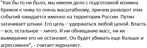 Он отметил, так или иначе, хозяин Кремля полным ходом готовится к чему-то крайне серьезному, что должно непременно произойти на территории РФ. Этому по большей степени способствует экономическая дестабилизация страны, влекущая за собой волну недовольства россиян.