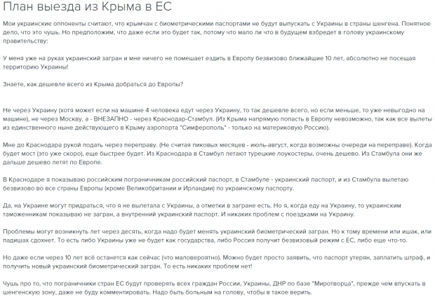 Розчарували ті материкові росіяни, які заздрять. Кримчани не мають можливості на відміну від вас нормально отримувати Шенген; безвізовий режим - це лише мала компенсація від України за ті незручності, які відчувають жителі Криму. До того ж, кримчани 23 роки страждали від українізації. Україна повинна це компенсувати,– написала кримчанка.