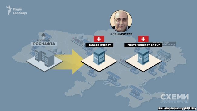 Государственная компания «Роснефть» поступила как «Лукойл» и продала в 2016 году свои активы в Украине. А это - почти 150 заправок, в основном под брендом «ТНК», сеть нефтебаз и Лисичанский нефтеперерабатывающий завод. Покупателем оказалась малоизвестная швейцарская фирма Glusco Energy. Это дочерняя структура другой швейцарской фирмы - Proton Energy Group, официальный владелец которой - израильский бизнесмен Нисан Моисеев.