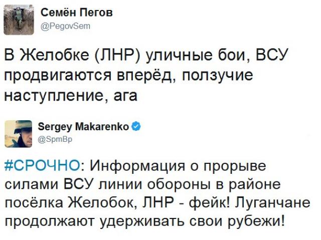 «В Желобке уличные бои. ВСУ продвигаются вперед», — пишут пропагандисты боевиков. Некоторые продолжают опровергать эту информацию, однако подобных сообщений все больше.