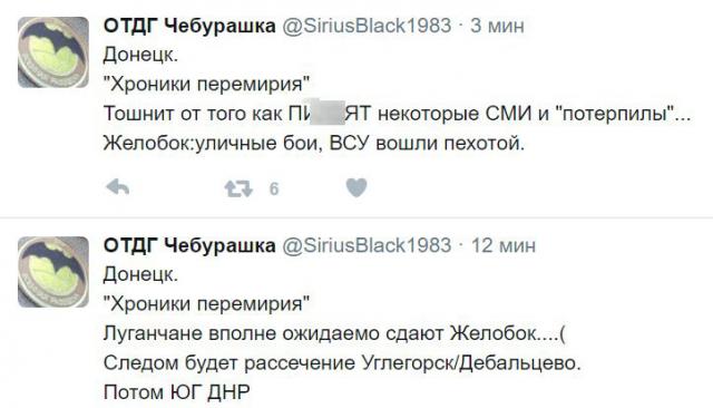 «Луганчане вполне ожидаемо сдают Желобок… Следом будет рассечение Углегорск/Дебальцево… Потом юг „ДНР“», — прогнозирует боевик под ником «Сириус Блек».