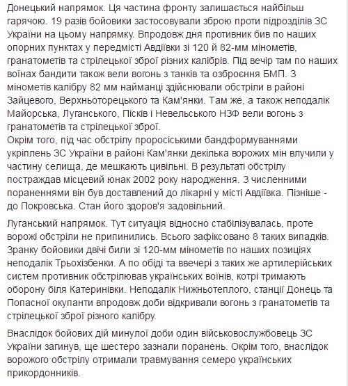 «В течение дня противник бил по нашим опорных пунктах в пригороде Авдеевки из 120- и 82-мм минометов, гранатометов и стрелкового оружия различных калибров. Под вечер там по нашим воинам бандиты также вели огонь из танков и вооружения БМП. Из минометов калибра 82 мм наемники осуществляли обстрелы в районе Зайцево, Верхнеторецкого и Каменки. Неподалеку Майорска, Луганского, Песок и Невельского НЗФ вели огонь из гранатометов и стрелкового оружия. Кроме того, в районе Каменки несколько вражеских мин попали в часть поселка, где живут гражданские. В результате обстрела пострадал юноша 2002 года рождения. С многочисленными ранениями он был доставлен в больницу Авдеевки, позже в Покровск. Состояние его здоровья удовлетворительное», — информировал Миронович.