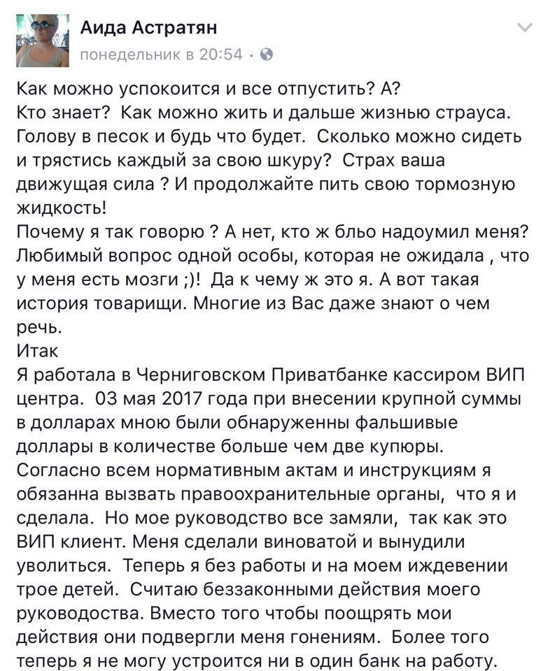Сотрудница Черниговского ВИП отделения Приватбанка Аида Астратян обнародовала на своей странице в Фейсбуке шокирующую историю о работе одного из отделений Приватбанка.