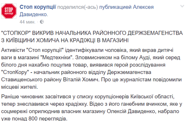 Богачом, укравшим детские весы за 600 грн в одном из магазинов Киева, оказался начальник районного отдела Госземагентства Ставищенского района Виталий Хомич.