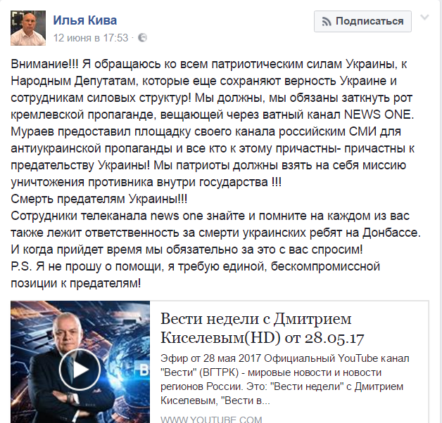 Как подчеркнул Кива, Мураев создал для российских СМИ на базе своего канала площадку для антиукраинской пропаганды.