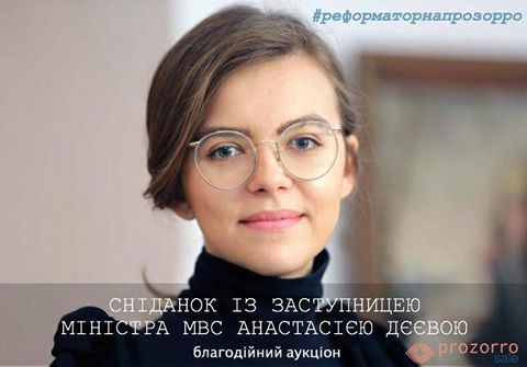 13 июня заместительница министра внутренних дел Украины по вопросам евроинтеграции Анастасия Деева на благотворительном аукционе электронной системы ProZorro выставила на продажу завтрак в своей компании со стартовой ценой 100 гривен.