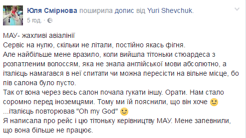 "МАУ - ужасные авиалинии. Сервис на нуле, сколько не летали, постоянно какая-то фигня. Но больше всего меня поразило, когда вышла тетушка стюардесса, которая не знала английского языка абсолютно, а итальянец пытался у нее спросить можно пересесть на свободное место, потому что половина салона было пустой. Так вот она через весь салон начала кричать на другую. Пахать. Нам стало стыдно перед иностранцами. Поэтому мы ей объяснили, что он хочет. Итальянец повторял "Oh my God". Я написала о рейсе и этой тетушке руководству МАУ. Меня заверили, что она больше не работает", - написала она.