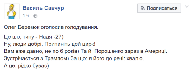 "Олег Березюк объявил голодовку. Это что, типа - Надя-2?) Ну, люди добрые. Прекратите этот цирк! Вам уже давно не по 6 лет) Да и Порошенко сейчас в Америке. Встречается с Трампом)", - пишет пользователь Василий Савчур.