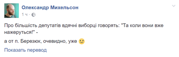 "О большинстве депутатов благодарные избиратели говорят: "Да когда они уже нажрутся!" А вот г-н Березюк, очевидно, уже", - пишет журналист Александр Михельсон.