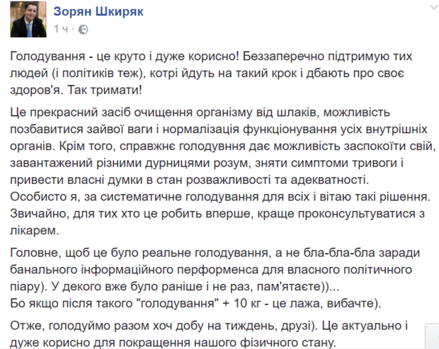 Главное, чтобы это было реальное голодание, а не бла-бла-бла ради банального информационного перформенса для собственного политического пиара). У некоторых уже было раньше и не раз, помните))...", - пишет советник глвы МВД Зорян Шкиряк.