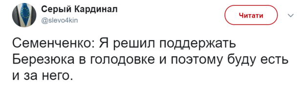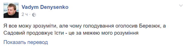 "Я все могу понять, но почему голодание объявил Березюк, а Садовый продолжает есть - это за гранью моего понимания", - пишет журналист Вадим Денисенко.