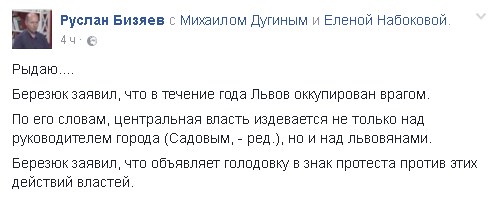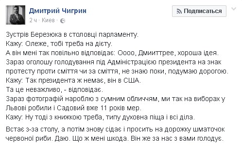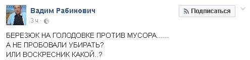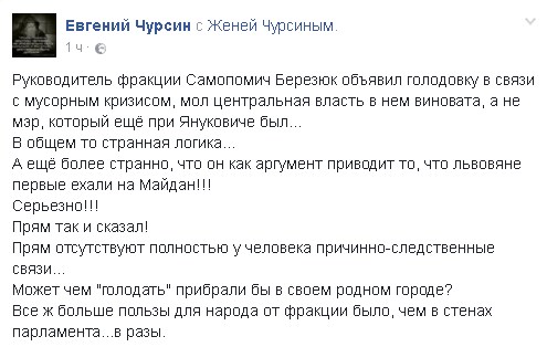 "Руководитель фракции Самопомич Березюк объявил голодовку в связи с мусорным кризисом, мол центральная власть в нем виновата, а не мэр, который ещё при Януковиче был... В общем то странная логика... А ещё более странно, что он как аргумент приводит то, что львовяне первые ехали на Майдан!!! Серьезно!!! Прям так и сказал! Прям отсутствуют полностью у человека причинно-следственные связи... Может чем "голодать" прибрали бы в своем родном городе? Все ж больше пользы для народа от фракции было, чем в стенах парламента...в разы", - пишет блогер.