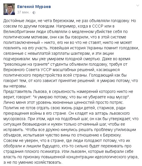 "Представитель Львова, в серьезность намерений которого никто не верит, говорит: "я умираю потому, что вы не убираете наш мусор". Лично меня этот уровень жизненных ценностей просто потряс. Политик не готов отдать свою жизнь ради детей, стариков, ради прекращения войны в его стране. Он кладет на алтарь львовского мусоровоза. При этом, идя на подобный шаг, он как бы утверждает, что ситуация безвыходная и нужен только отчаянный шаг, чтобы ее исправить. Чтобы все дружно кинулись решать проблему утилизации объедков, испытывая чувство вины по отношению к Березюку", - иронизирует Евгений Мураев, отметив, что львовяне сами выбрали себе власть - "по признаку повышенной концентрации идеологического угара, а не по умению хозяйствовать".