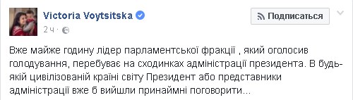 "Уже почти час лидер парламентской фрации, который объявил голодовку, пребывает на ступеньках администрации президента. В любой цивилизованной стране мира Президент или представители администрации уже бы вышли хотя бы поговорить", - написала Войцицкая.