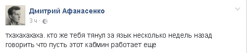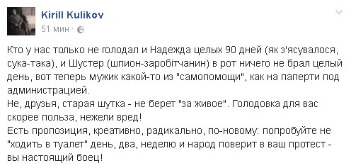"Кто у нас только не голодал и Надежда целых 90 дней, и Шустер в рот ничего не брал целый день, вот теперь мужик какой-то из "самопомощи", как на паперти под администрацией. Не, друзья, старая шутка - не берет "за живое". Голодовка для вас скорее польза, нежели вред!", - пишеь Кирилл Куликов.