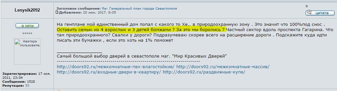 6. Севастопольская вата выгребает камни с неба: “На генплане мой единственный дом попал с какого-то Хе… в природоохранную зону. Это значит, что 100% под снос. Оставить семью из 4 взрослых и 3 детей бомжами? За это мы боролись? Частный сектор вдоль проспекта Гагарина. Что там природоохранного? Свалки у дороги? Подскажите, куда идти писать эти бумажки, если это хоть на 1% поможет?”
