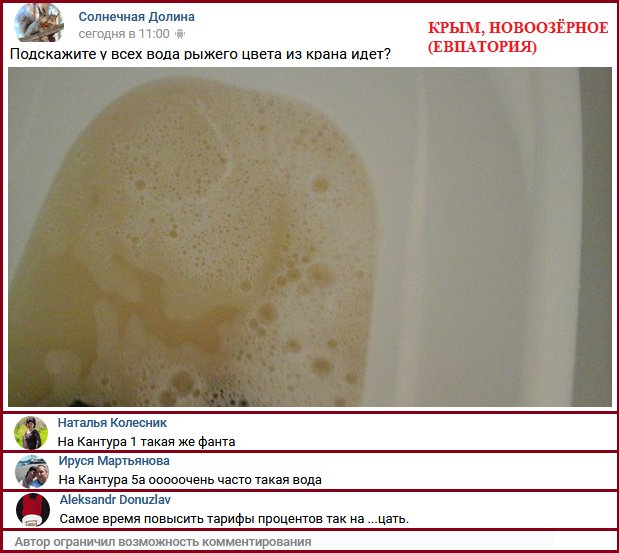 12. В Новоозерном (Евпатория) все чаще и чаще вода из крана идет цвета кваса. Оккупанты ничего не объясняют