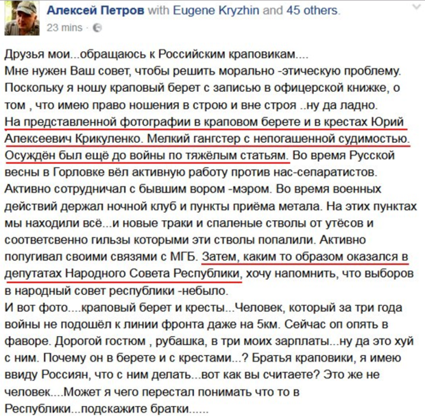 "На представленной фотографии в краповом берете и в крестах Юрий Алексеевич Крикуленко. Мелкий гангстер с непогашенной судимостью. Осуждён был ещё до войны по тяжёлым статьям. Во время Русской весны в Горловке вёл активную работу против нас-сепаратистов. Активно сотрудничал с бывшим вором-мэром. Во время военных действий держал ночной клуб и пункты приёма металла... Активно попугивал своими связями с МГБ. Затем, каким-то образом оказался в депутатах "народного совета республики", хочу напомнить, что выборов в "народный совет республики" не было", - пишет Петров.
