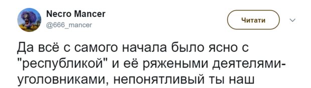 "Да всё с самого начала было ясно с "республикой" и её ряжеными деятелями-уголовниками, непонятливый ты наш", - пишет пользователь Necro Mancer.