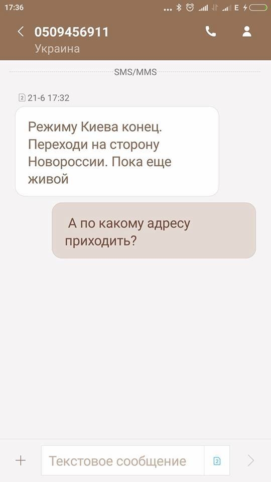 "Режиму Киева конец. Переходи на сторону "Новороссии". Пока еще живой", - сказано в самом сообщении сторонников "Л/ДНР".
