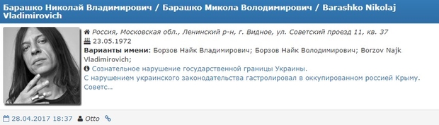 Стоит также отметить, что Барашко Николай Владимирович, он же Найк Борзов, числится в украинской базе преступников "Миротворец", где его обвинили в нарушении государственной границы. Об этом свидетельствует соответствующая запись.