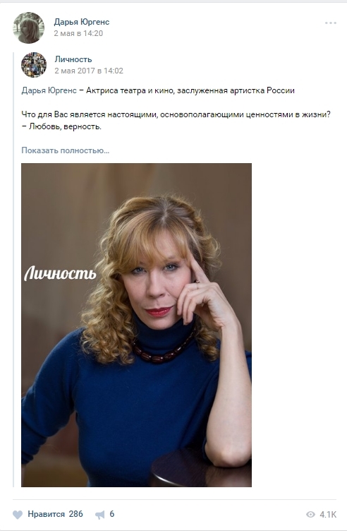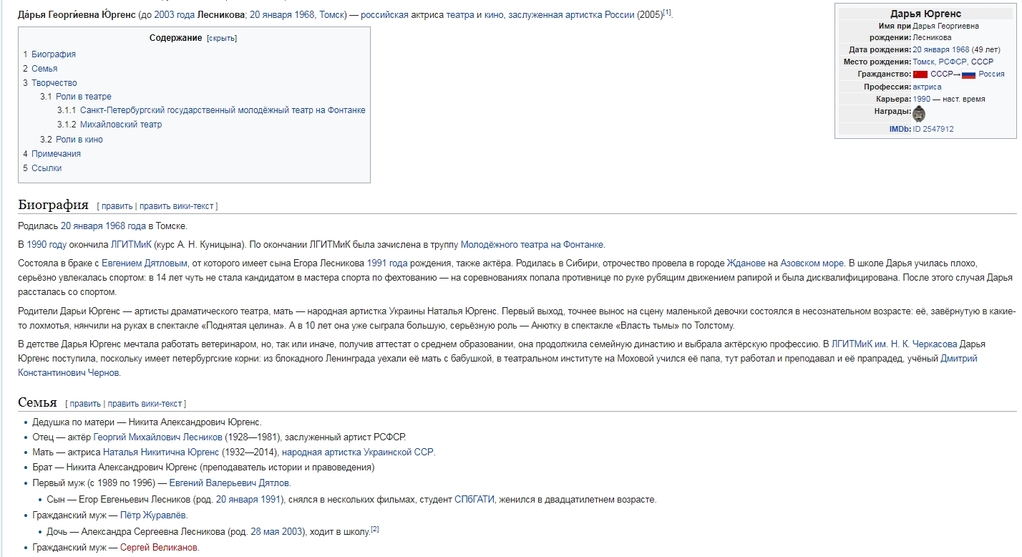 "Юргенс Дарья Георгиевна. Российская актриса театра и кино, заслуженная артистка России", - говорится в сообщении.